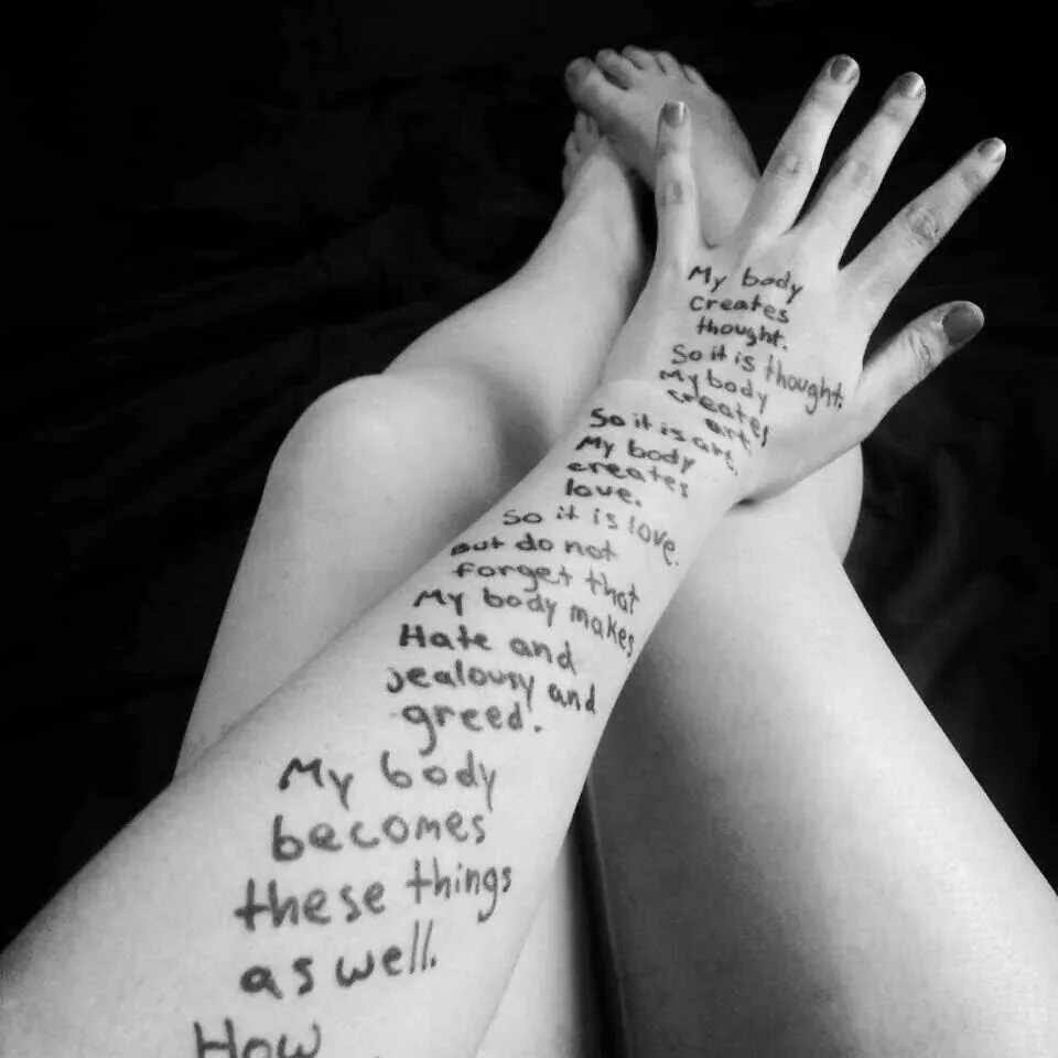 Ink is an alternative way to express yourself! When you write or draw on yourself, it shows what you think and feel at different moments in your life, and it turns those thoughts and feelings into art. When you take a photo to capture it, you create something beautiful and true to yourself, and maybe you can share that with the world.